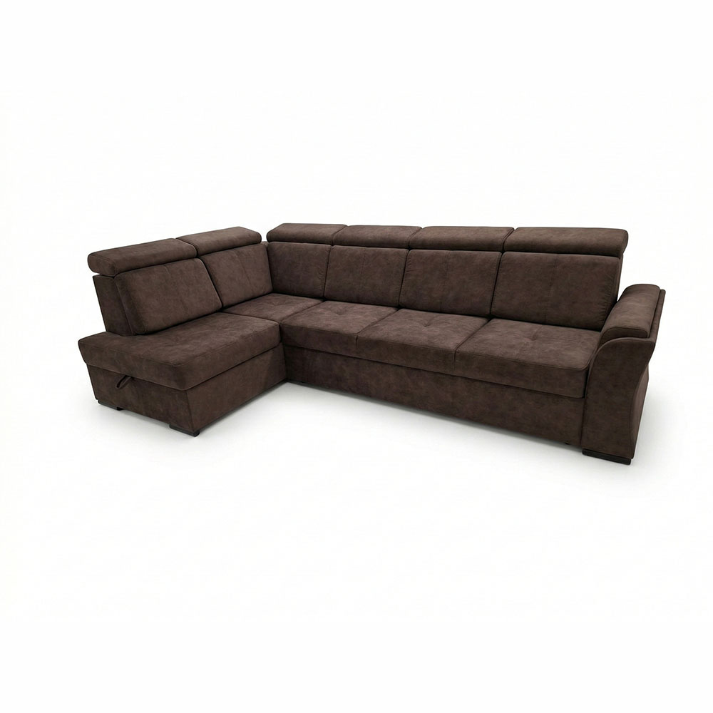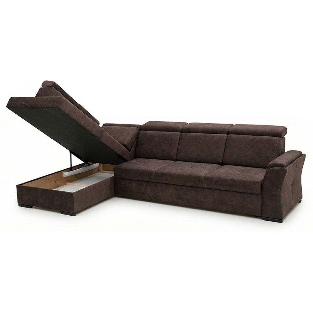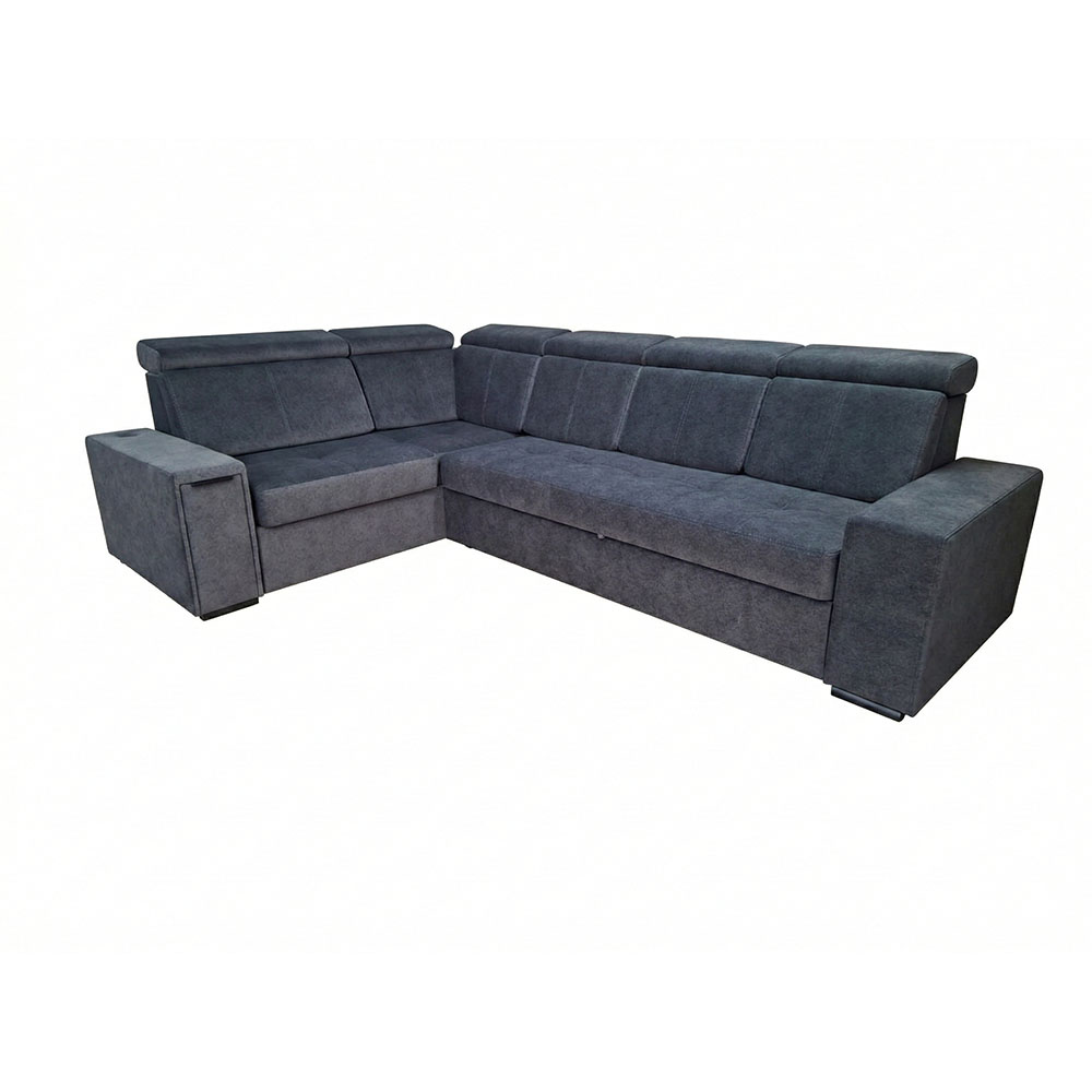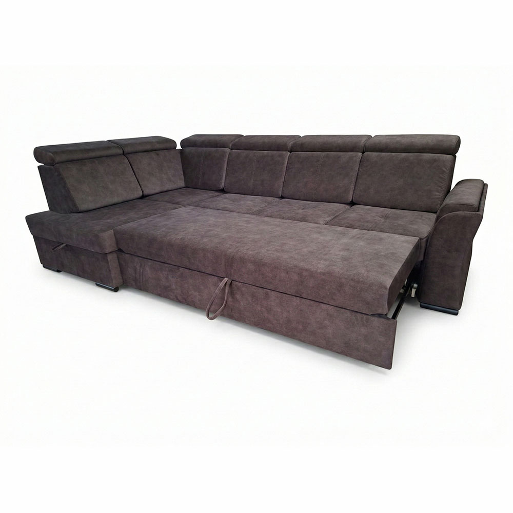 Wygodna funkcja spania: Dzięki intuicyjnemu i lekkiemu systemowi rozkładania (widocznemu na zdjęciach wózkowi wysuwanemu spod siedziska), narożnik w kilka chwil zamienia się w przestronne i równe łóżko. To idealne rozwiązanie do codziennego spania lub podczas wizyty gości.